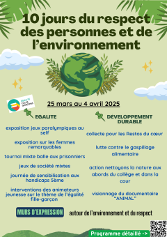 Du 25 mars au 4 avril, les éco-délégués et le CVC invitent le collège à se mobiliser autour du RESPECT des personnes et de l’environnement.