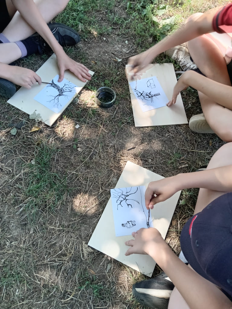 Afin de réaliser un croquis du paysage qui les entoure, ils ont trouvé des pinceaux naturels et utilisé l’encre gallique réalisée en classe. Pour développer leur créativité et leur imagination, ils ont fait du Land Art sur la voie verte.